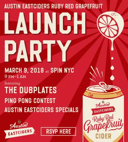 Join Austin Eastciders as they put a spin on cider with their newest flavor…Ruby Red Grapefruit! The party kicks off at 9pm but feel free to head over early early because Spin NYC opens at 11AM and we’ll be hanging all night.