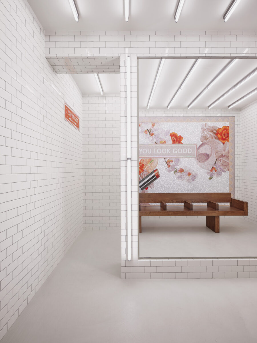 - As guests continue to explore the space, they will see hidden touches that reference architectural and design motifs found in the New York City Subway. From barrel-vaulted ceilings to large mosaic-tile murals done by the same artist whose work can be found in many of the city’s stations, these details fuse the interior, residential design approach with details you find in day traveling through NYC. A secret “You Look Good.” room in the back of the store has a larger-than-life Glossier mural (featuring Glossier You Solid and Generation G) and a wooden bench inspired by subway platform seating.