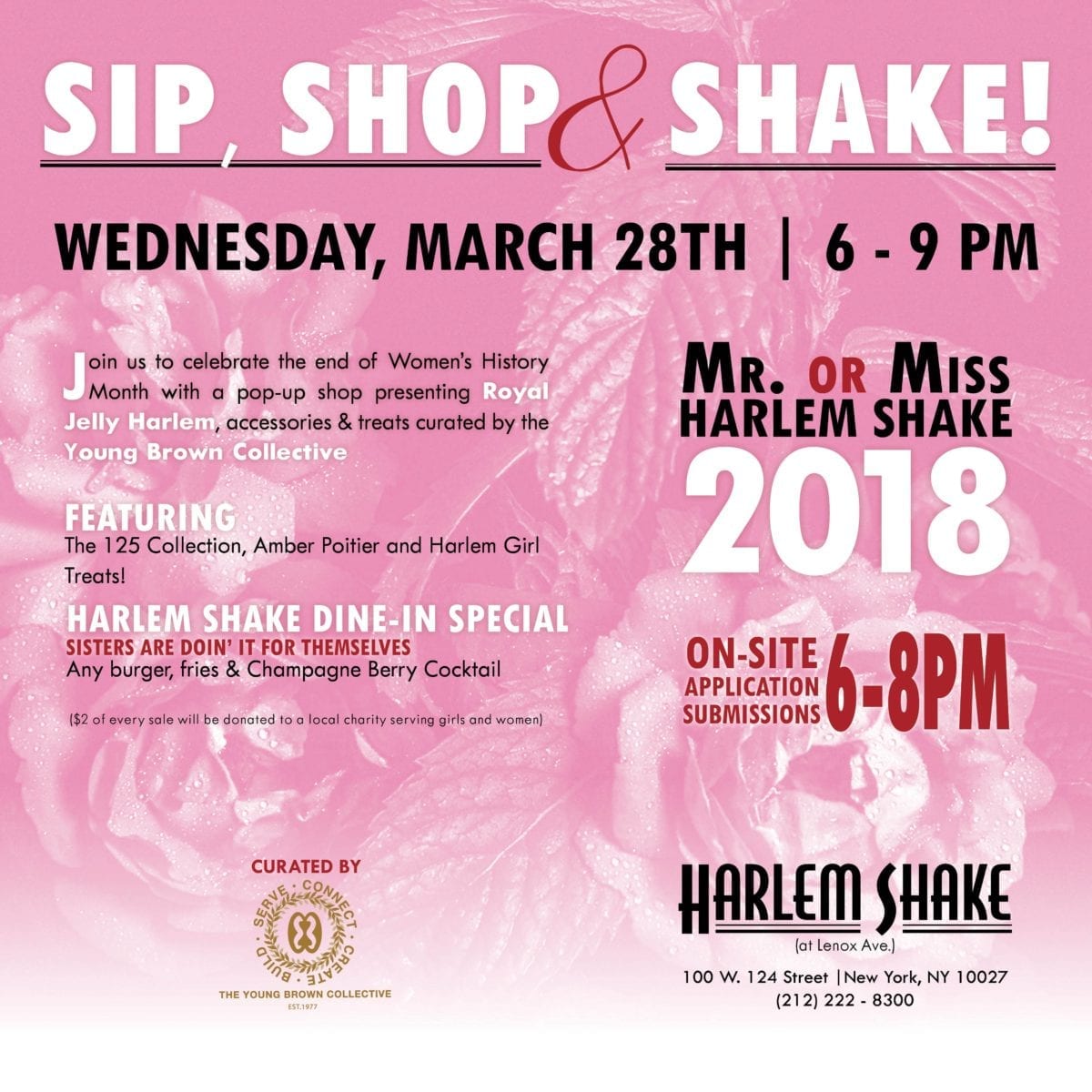 @HarlemShakeNYC 6-9pm Harlem Shake 100 W. 124 Street Harlem Shake hosts its second annual pop-up shop Sip, Shop & Shake celebrating Women’s History Month.