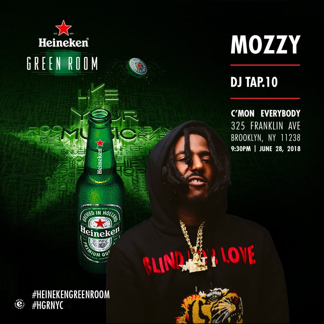 #HGRNYC @Tap10 @CmonEverybodyBK @LittleGiantCreative 9:30pm C’mon Everybody 325 Franklin Avenue Brooklyn This month, rapper on the rise, Mozzy hits the Heineken Green Room stage.