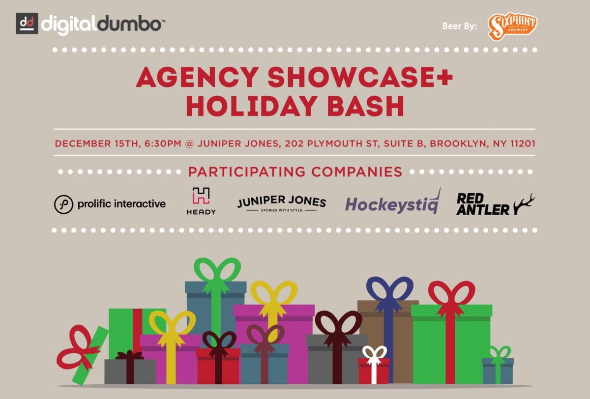 Join us for our Agency Showcase + Holiday Bash at Juniper Jones’ beautiful loft space in DUMBO. We’ll have beer from Sixpoint, music from DJ’s Allen Mclean, and presentations from Prolific, Heady, Juniper Jones, Hockeystiq, and Red Antler. It’ll be our last event of the year, so no excuses not to be there!