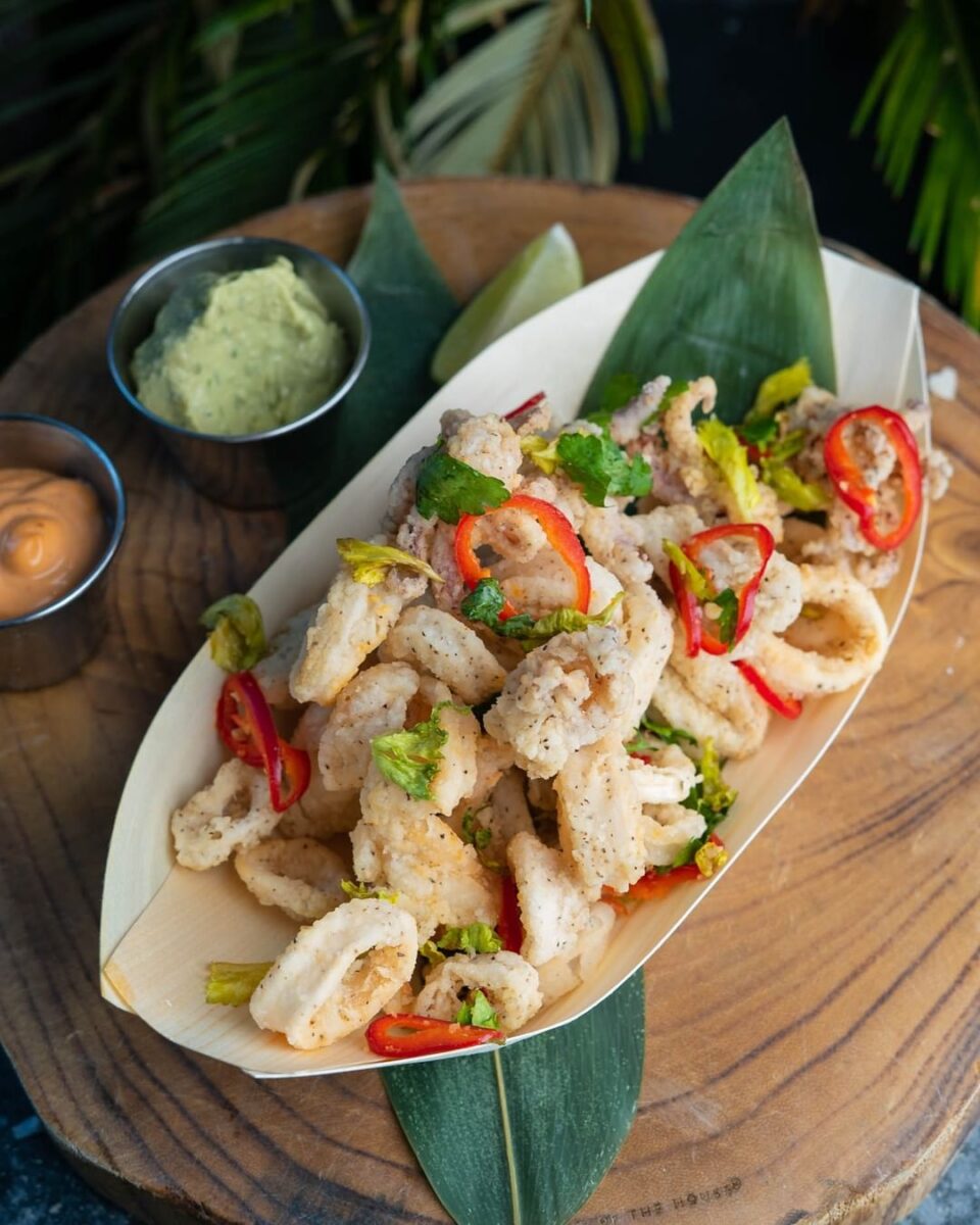 Apps/Entrees: PHD Terrace Catch (Calamari, Shrimp, Scallops with Spicy Avocado Citrus Dip, and Spicy Mayo)