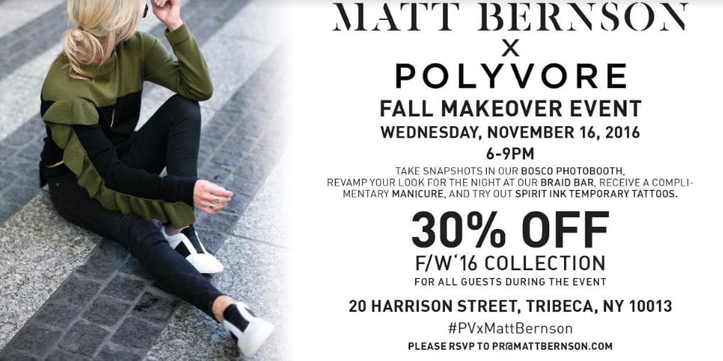 Matt Bernson will be teaming up with social commerce site, Polyvore, for an in-store Fall fashion, shopping and makeover event at our Tribeca location. The event will include a photo booth from Bosco, a braid bar, gel manicurist and temporary tattoo station for guests to enjoy.