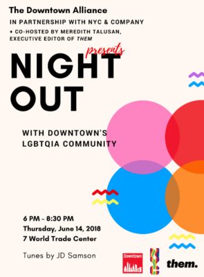 Co-hosted by Meredith Talusan, executive editor of them, and with remarks by Fred Dixon, CEO and President of NYC & Company, and Jessica Lappin, President of the Alliance for Downtown New York, this is one NightOut you don’t want to miss! Tunes will be provided by JD Samson.
