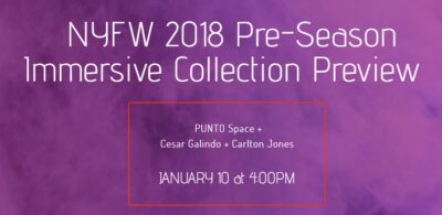 Join PUNTO Space for a stylish sneak peek of select Cesar Galindo NYFW 2018 fall fashions and a glimpse of designer Carlton Jones’s capsule.