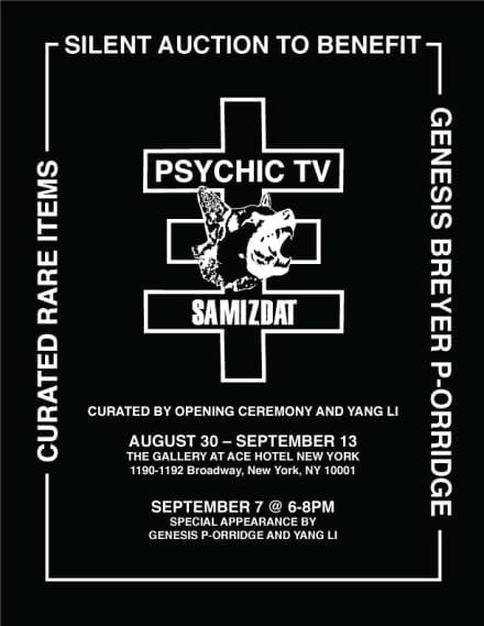 Every item displayed has been hand-selected from Psychic TV’s personal collections. One hundred percent of funds raised will be donated to support Genesis in her battle with Myelomonocytic Leukemia and towards assisting with the increasing medical expenses.