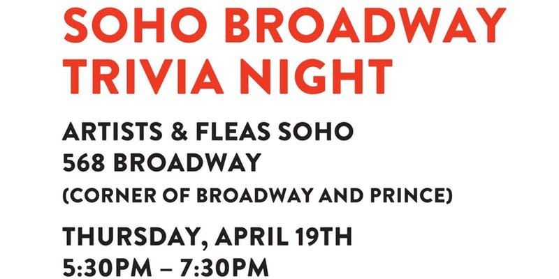 Come test your local knowledge and challenge your SoHo Broadway colleagues, friends and neighbors with prizes from: Artists & Fleas, Black Gold Records, Boxed, City Chefs NYC, Douglas Dunn +Dancers, Force Brands, Rise by We Work and We Work.