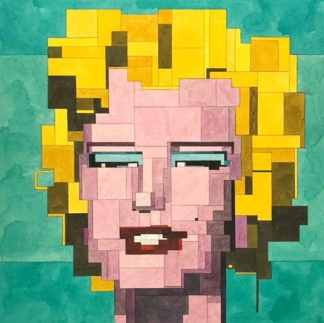 Lister breaks down these classic images to their most elemental forms by combining the deconstructed and minimal aesthetic of pixelated graphics with the transparency of watercolor paint and the flatness of acrylic paint. The artist explores the relationship of nostalgia and mathematics, taking on subjects that hold a collective familiarity and reducing them to flat cubist-like compositions.